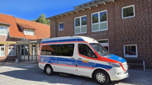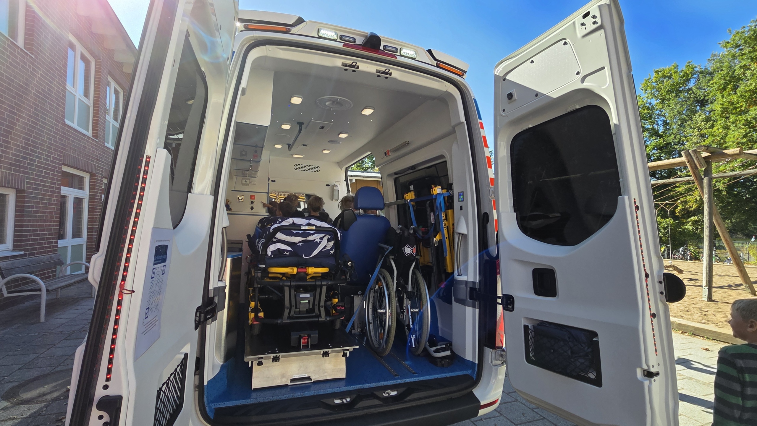 Für die Übergabe der Spende besuchte uns der Wünschewagen direkt an der Schule. Gemeinsam mit zwei ehrenamtlichen Helferinnen des ASB durften wir einen Blick hineinwerfen, alles ganz genau entdecken und ihnen viele spannende Fragen stellen.